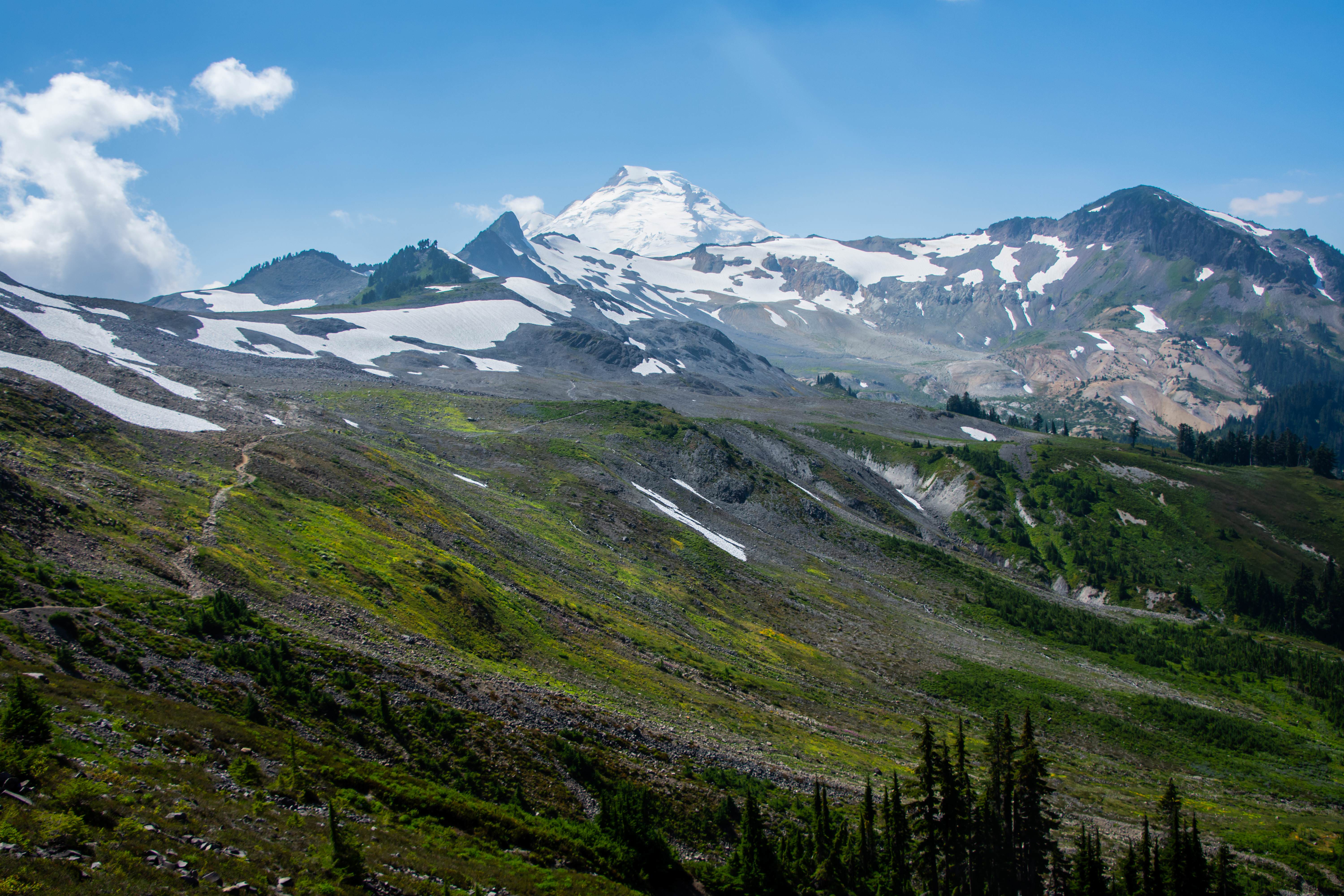 The drive up to the ski area was fine - only a few spots of snow on the road. The dominant feature in the North Cascades is Mount Baker a glaciated volcano that can be seen on clear days from as far as Seattle and makes a great backdrop for photos of Vancouver BC. At the end you hit the Artists Point parking lot which had a couple hundred people milling about on the August weekday I went.
